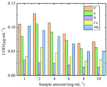 用于制备悬浮液的样品量也会显著影响TXRF分析。 为了在全反射条件下进行分析, 必须将样品作为薄层置于反射载体上, 因此沉积样品的厚度(例如植物悬浮液的量)被视为是与基体效应相关的关键参数并且会影响元素测定。 本实验通过添加不同重量的粉末样品于5 mL去离子水中制备了6种浓度悬浊液, 从而对添加的样品量进行分析。 图2显示了净计数随样品量的变化关系, 悬浊液中各元素的净计数会随进样量的增加而增加, 但明显能看出P, S, Ca这三种元素在样品量大于6 mg· mL-1后趋于饱和, 这是由于进样量过高会导致元素达到饱和状态, 样品薄膜厚度超过了射线的测量厚度, 有可能不再处于全反射条件下, 样品中元素不能全部被X射线激发。 图3则显示了进样量对相对标准偏差的影响, 样品量在1 mg· mL-1时重复性较差, 大于1 mg· mL-1的样品量重复性没有显著差异, 但当样品量增加至8 mg· mL-1时, 重复性也略微降低。 同时计算了各进样量下的检出限, 结果如图4所示, 结果显示随着样品量的增加, 检出限也略微改善, 但影响并不显著。 鉴于过高的样品量会导致在玻片上形成的样斑不再适用于全反射的测量, 并考虑到结果的可重复性与检出限, 在进一步的实验中使用4 mg· mL-1的样品量。