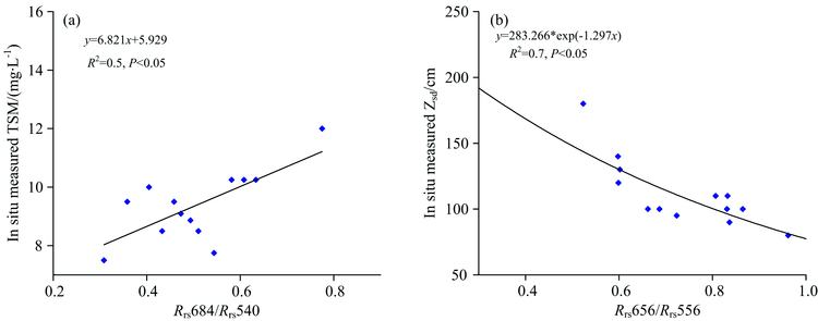 式(3)中, TSM为于桥水库的悬浮物浓度, Rrs (684)/Rrs(540)为珠海一号684 nm波段与540 nm波段遥感反射率的比值。 式(4)中, Zsd为于桥水库的水体透明度, Rrs(656)/Rrs(556)为珠海一号656 nm波段与556 nm波段遥感反射率的比值, 建模的结果如图2所示。