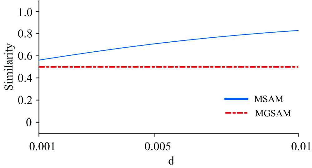 由式(3)和式(4)可以看出, 当SAM为0时, MSAM为0.5, 此时x1和x2是两个相互垂直的向量, 表明光谱相似度为0。 另一方面, 由于待比较的两条光谱曲线往往具有同源性, 即通常情况下∇x1和∇x2的所有元素同号, 此时MGSAM≥ 0.5。 因此在同源光谱比较中, 当MSAM和MGSAM取值为0.5时, 意味着光谱相似度很低。 但在更广泛的应用中, 如物质探测等, 取值范围为[0, 1], 且两者都是值越接近1, 表明x1和x2的相似度越高。