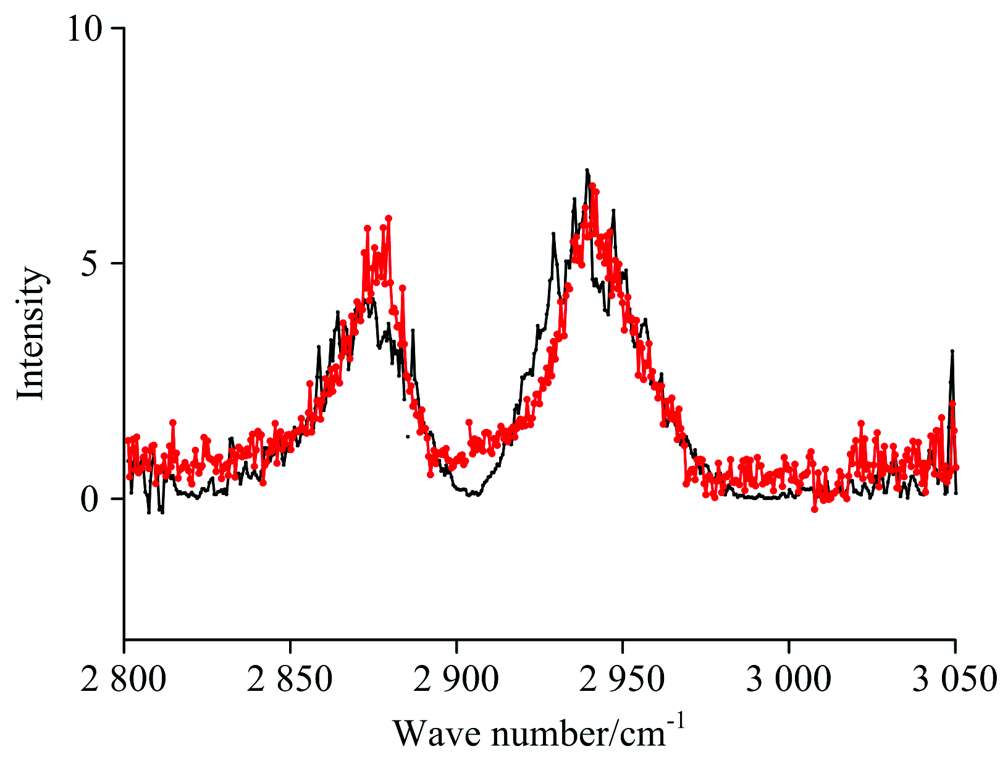 图6模拟了CH3对称(蓝色)和反对称(红色)振动峰的