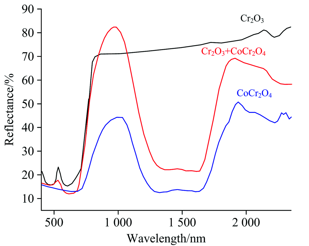 | 图7 Cr2O3, Co掺杂Cr2O3和CoCr2O4的可见近红外反射光谱图[23]Fig.7 Vis-NIR reflection spectra of Cr2O3, Co doped Cr2O3 and CoCr2O4[23] |