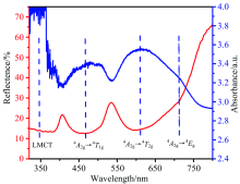 | 图5 氧化铬的紫外可见吸收光谱(蓝色曲线)和反射光谱(红色曲线)Fig.5 UV-Vis absorption spectrum (blue curve) and reflection spectrum (red curve) of chromium oxide |