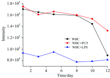 实验结果表明, 主荧光峰的发射强度随着离体时间延长而减小, 表明随着白细胞的凋零, 其荧光强度逐渐减弱。 从图中加入了脂多糖的白细胞实验结果(蓝色线)可以看出, 脂多糖环境下的白细胞的荧光发射强度在前8天内持续减弱, 第8天之后达到稳定值。 加入葡聚糖的白细胞荧光发射一定程度上维持着与普通白细胞的荧光发射, 在细胞自然凋亡的前10天, 葡聚糖环境下的白细胞荧光强度持续表现出与正常细胞相当的荧光水平。 第10~12天的葡聚糖环境下的白细胞荧光强度略强于正常白细胞, 表明其荧光衰减速度比普通白细胞慢, 葡聚糖延缓了白细胞荧光发射的衰减。