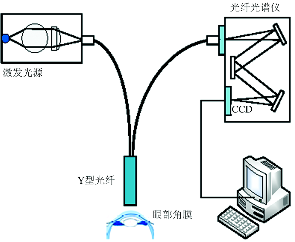 角膜晚期糖基化终末产物荧光光谱检测系统由集成紫外激发光源、 Y型光纤探头、 微型光纤光谱仪和PC端光谱处理显示软件组成, 系统组成示意图如图1所示。 其中激发光源采用的是景颐光电科技有限公司生产的UVA波段的紫外LED集成光源, 峰值波长约为370 nm, 光谱带宽约为20 nm, 光源的功率为0~20 mW, 可通过调节电流或电压的方式控制LED的亮度和可通过SMA905接头与光纤连接, 光源耦合效率高, 还具有使用寿命超过10 000 h、 没有热辐变形、 照度衰减小、 输出光强稳定等特点; Y型光纤设计成“ 12+1” 结构, 光纤结构如图2所示, 由中间一根直径为600 μ m的荧光收集光纤和周围均匀排列12根直径为200 μ m的激发光纤组成, 收集光纤主要起到耦合激发光并传输的作用, 荧光收集光纤主要起到将收集到的荧光传输至光纤光谱仪的作用; 光纤光谱仪采用的是景颐光电科技有限公司生产的型号为USB6500-Pro的微型光纤光谱仪, 这是一款通用型微型光纤光谱仪, 检测范围扩展至180~1 100 nm波段, 该波段适用于角膜AGEs荧光检测, 并且具有较高的灵敏度、 高信噪比、 宽动态范围和准确度高等优点。