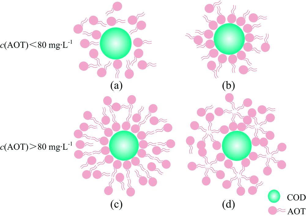 在c(AOT)< 80 mg· L-1时[如图8(a, b)], 各形貌COD的Zeta电位绝对值随c(AOT)增加而缓慢增加, 此时溶液中的AOT分子以带负电荷的“ 头部” 磺酸基利用库仑力吸附在晶体表面, 形成单分子层[图8(b)], 带负电荷的磺酸基团会直接与晶体表面的Ca2+作用, 即磺酸根离子有一部分需要用来抵消COD表面的正电荷, 因此, Zeta电位变负的趋势更加缓慢。 当c(AOT)> 80 mg· L-1时, 溶液中游离的AOT分子以“ 尾对尾” 的方式与晶体表面的AOT单分子层作用, 形成大量双分子层[图8(c)]和亚临界胶束, 甚至出现表面活性剂聚集体[图8(d)], 此时Zeta电位绝对值快速增大。 当c(AOT)> 250 mg· L-1时, AOT吸附量达到最大, Zeta电位也达到稳定状态。