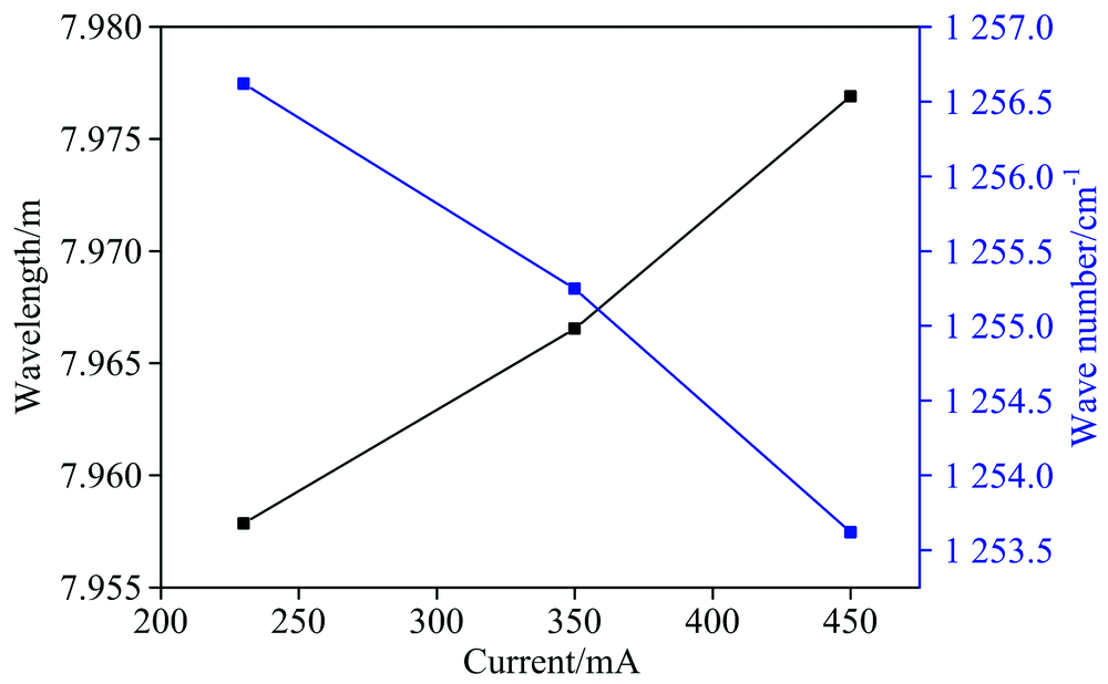 将QCL的温度控制在30 ℃, QCL输出激光波长与工作电流的关系如图3所示。 工作电流在225~450 mA时, 波长可调节范围为1 253.5~1 256.5 cm-1, 对比过氧化氢的吸收谱线, 在这一范围内, 过氧化氢存在吸收峰。