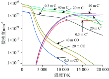 图3为C, C+和CO不同水深条件下数密度对比图, 从图中可以看出, 尽管三种水深条件下C, C+和CO的数密度变化趋势相同, 但C, C+及CO粒子随压力变化趋势并不是简单的线性关系, 不同粒子因压力改变的变化趋势并不一致: 对于CO粒子, 从0.3 m水深到40 m水深造成的数密度量级变化是非线性的, 随着水深程度的加大, 电弧数密度的变化幅度在快速增加。 不仅在量级上存在这种变化, 在相同量级对应的温度上可以看出, 0.3 m水深条件下的CO粒子, 在温度为11 000 K左右时数密度已经低于1015量级, 而20 m水深条件下直到温度达到16 000 k时数密度才低于1015量级, 40 m水深条件下更是接近20 000 k时才低于1015量级。 CO粒子的这种变化会反映在C粒子上, 由于反应CO→ C+O的发生, C粒子来源于CO分子的解离作用, 可见C粒子数密度随着水深程度的加大, 电弧数密度的变化幅度也在增加。 由于C+粒子来自电离反应C→ C++e, 其对应不同水深的量级变化趋势应与C粒子相同。