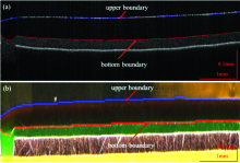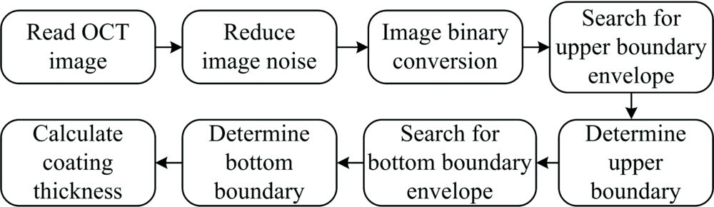 在之前的研究中, 我们小组成功地将超高分辨率谱域OCT结合基于图像梯度的边缘检测算法应用于三防漆涂层的厚度测量[15]。 该方法测量结果与传统金相切片有很好的一致性, 证明该方法较好的测量准确性。 然而, 该方法在实施过程中需要进行人为手动设置参数, 同时比较依赖于三防漆OCT图像的灰度特性。 此外, 该方法计算时间较长。 为此, 我们又提出了一种基于边界跟踪的边缘检测算法, 减少了人为手动参数设置, 提高了三防漆厚度检测的准确性。 并且在计算效率方面有了显著提升, 这为三防漆厚度的在线质检提供了可行性。