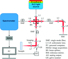 如图1所示, 所设计的超高分辨率SD-OCT系统主要由激光光源, 样品臂, 参考臂, 数据采集卡和光谱仪组成。 光源采用的是超连续谱激光光源(SC-5, Yangtze Soton Laser, Wuhan, CHN), 其中心波长为810 nm, 半峰值全宽(full width at half maximum, FWHM)为180 nm, 实验中测得光源的输出功率为15.6 mW。 从光源出来的光首先经过透镜L1(AC050-010-B-ML, Thorlabs Inc., Newtown, NJ, USA)进行准直, 然后通过单模光纤(630-HP, Thorlabs Inc., Newtown, NJ, USA)导向非偏振立方50∶ 50宽带分束器(BS008, Thorlabs Inc., Newtown, NJ, USA)中。 然后, 光束被分开并引导到参考臂和样品臂的光学器件中。 参考臂由透镜L2(AC050-010-B-ML, Thorlabs Inc., Newtown, NJ, USA)、 单模光纤(630-HP, Thorlabs Inc., Newtown, NJ, USA)、 透镜L3(AC050-015-B-ML, Thorlabs Inc., Newtown, NJ, USA)、 透镜L4(M Plan Apo NIR 20× , Edmund Optics Inc., Barrington, NJ, USA)和反射镜组成。 样品臂由扫描振镜(GVSM002/M, Thorlabs Inc., Newtown, NJ, USA)、 准直透镜L6(型号与L3相同)和物镜L7(型号与L4相同)组成。 从两臂反射回来的光在分束器中发生干涉, 最终通过准直透镜L8(AC050-010-B-ML, Thorlabs Inc., Newtown, NJ, USA)和单模光纤(630-HP, Thorlabs Inc., Newtown, NJ, USA)耦合到光谱仪中。 由光谱仪探测到的干涉信号通过图像采集卡采集, 再经过信号处理便可重建出图像。