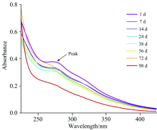 图2显示小麦秸秆堆肥过程中DOM的UV-Vis光谱均呈现随波长增加吸收强度下降的特征, 类似于猪粪[11]和鸡粪[12]等堆肥DOM的UV-Vis光谱特征。 此外, 1~38 d堆肥DOM的UV-Vis光谱均在280 nm附近出现一个明显的吸收平台, 从56 d开始, 该吸收平台逐渐消失。 研究表明, 280 nm处吸收峰可能来自木质素及其衍生物等特征有机物的吸收, 由此可知小麦秸秆堆肥过程中木质素等组分发生显著分解, 而中间产物通过生物降解或化学聚合作用也不断减少[4]。 该演化特征与畜禽粪便堆肥DOM的UV-Vis光谱峰型变化特征一致[12]。 值得注意的是, 整个秸秆堆肥期间DOM的UV-Vis光谱基本呈现下降趋势, 尤其是98 d的DOM光谱强度明显低于1 d, 表明堆肥DOM中芳香族化合物含量显著减少。 这可能与微生物的降解或化学聚合生成不溶水的大分子腐殖质有关。 文献报道的畜禽粪便堆肥过程中DOM的UV-Vis光谱基本呈增加的趋势[12]。 对比可知秸秆单一物料堆肥与畜禽粪便(包括与秸秆共肥)堆肥过程中DOM的分子结构和组成演变存在差异。