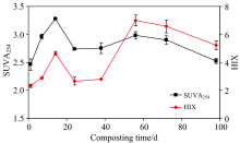 (2)堆肥期间DOM的SUVA254和HIX呈现类似的动态演变趋势, 说明DOM的芳香化和腐殖化具有相似的演变特征; 堆肥后期的HIX显著高于初期, 表明腐熟的小麦秸秆堆肥DOM具有较高的腐殖化程度;