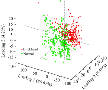 潜变量得分空间分布图(仅绘制主要的前三个LVs), 见图7, 描述了样本在新投影空间的坐标位置, 同一类别样本在得分空间的坐标位置较接近。 由图7可以看出健康薯和黑心薯两类样品可以得到较好的区分, 只有少数样品没有被区分开。