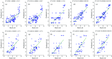 从图2中可以看出, 隐含层函数为“ Hardlim” 的网络结构RMSE和R2均值均要优于“ Sigmoidal” , “ Sine” , 故隐含层函数选择“ Hardlim” 。 其次, 当隐含层函数为“ Hardlim” 时, RMSE值随隐含层节点个数波动极小, 忽略不计, 故直接取R2最大时隐含层对应的节点数。 由此, ELM神经网络最优的隐含层函数为“ Hardlim” , 最优的隐含层节点数为31。 此时R2, RMSE平均值分别为0.551 37, 1.119 8。