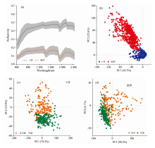 干、 湿光谱主成分分析显示[图2(c, d)], 前两个主成分都共同解释了90%以上的总体变异。 但湿样的第一主成分(PC1)占了90.5%, 明显高于干样的PC1(79.3%)。 这可能是由于受水分的影响, 令光谱的个性减弱共性增强。 此外, 两种地类不论干样还是湿样都呈现了聚集的特征, 且两者之间存在一定的重叠。 与草地相比, 农田的主成分空间分布更散, 可能是因为SOC含量较草地偏低影响所致, 其主成分空间分布较散。