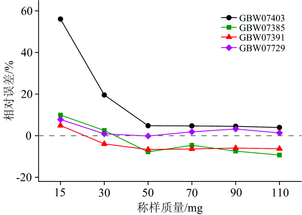 称样量对样品的分析过程及分析结果都有较大影响, 当称样量较大时, 容易造成样品熔融不佳。 称样量少时, 样品代表性较差。 选择不同类型的国家一级地球化学标准物质, 研究称样量对标准物质测定准确度的影响, 结果见图1。 当称样量小于50.0 mg时, 样品代表性较差, 低含量样品有机碳的测定值偏高; 称样量为50.0~110.0 mg时, 测定值与标准值基本吻合。 但样品加入量过大易发生喷溅现象, 不利于碳的稳定释放。 结合前人研究, 本实验最终确定样品的称样量为50.0~70.0 mg。