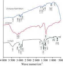 图10是弱碱条件(pH值为9)下的红外光谱。 图10中, 曲线1是油酸钠的红外光谱。 曲线2是NH4Cl的红外光谱。 加入NH+4后与油酸钠相互作用的萤石的红外光谱(图10中曲线3)中, 2 925 cm-1处为— CH2— 的反对称伸缩振动峰, 对比图10中曲线(1), 峰位红移了3 cm-1, 2 854 cm-1处为— CH2— 的对称伸缩振动峰, 峰位偏移了4 cm-1; 碱性条件下, 并未出现— CH3和— COO-的吸附, 仅出现了— CH2— 的特征峰峰位红移, 且红移量减小, 说明在碱性条件下NH+4的水解对— CH2— 的化学吸附有一定程度的削弱作用, 并且影响了— CH3和— COO-在萤石表面的吸附, 与不加NH+4的萤石与油酸钠作用后的红外光谱(图8中曲线3)相比, 其特征峰强度减弱, 对萤石浮选起到抑制作用。