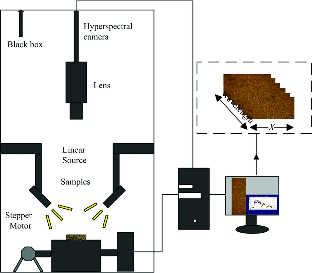 The hyperspectral image acquisition system mainly included an imaging spectrometer (ImSpector, V10E, Finland), a set of 150-W optical fiber halogen lamps (DC-950A, Dolan-Jenner, Co., USA), and a set of high precision conveying devices (Zhuoli Hanguang, SC300-1A, Beijing) along with other components. Figure 1 shows a schematic diagram of the structure. The (20± 0.5) g of fermented leaves were weighed on an electronic scale as a sample and were evenly spread in a quartz culture dish with the size of ϕ 70 mm× 10 mm. The stacking thickness was 15 mm, and the top of samples was flushed with the upper surface of the dish. Then, the hyperspectral image was collected. The sampling interval was 1 h each time, and a hyperspectral image was collected in the upper, middle, and lower layers, respectively. Importantly, a rectangular hyperspectral image containing 300× 300 pixels was used as the region of interest (ROI). Each image selected eight ROIs; four each on the left and the right sides, which were symmetrically distributed. The average value of spectra in ROI was calculated, and eight spectra were extracted from each layer. As a result, 144 spectra were obtained.