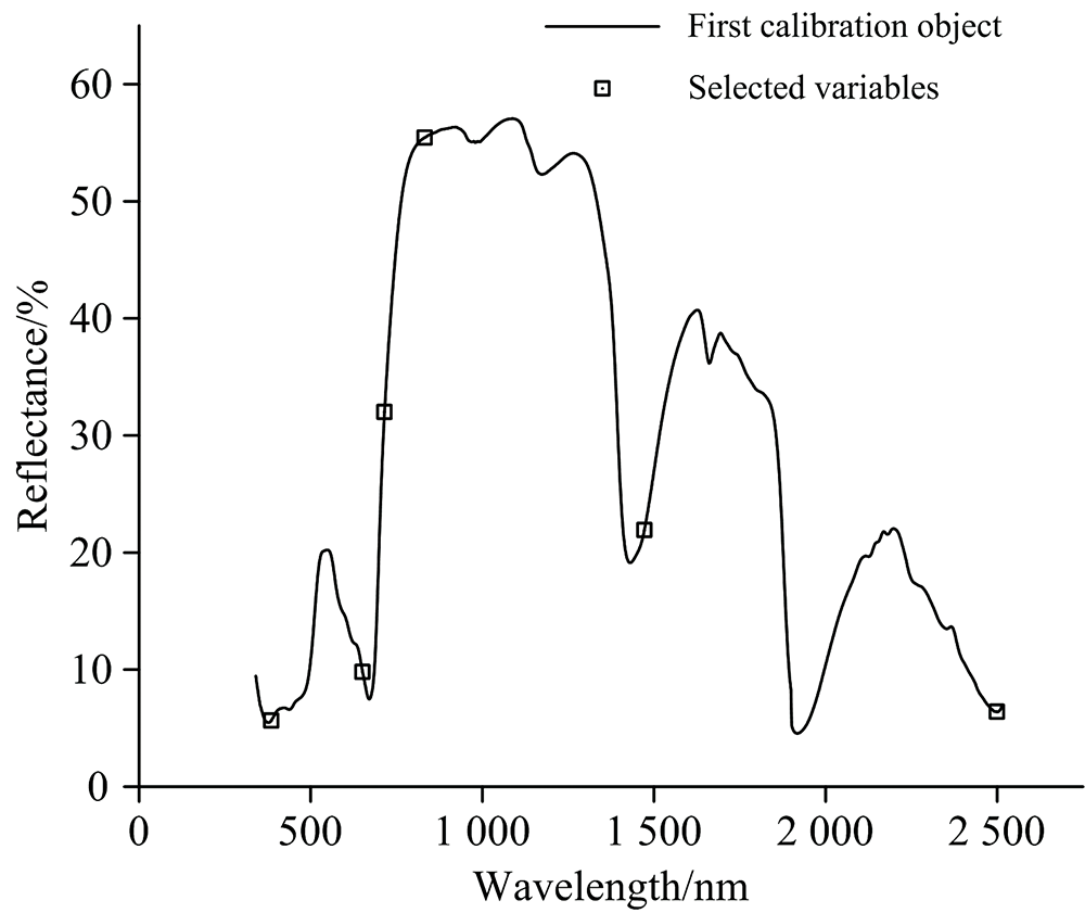 | 表4 SPA选择的特征波长与玉米叶片中Cu2+含量的预测表达式 Table 4 The prediction expression of Cu2+ content in corn leaves and characteristic wavelengths selected by SPA |
