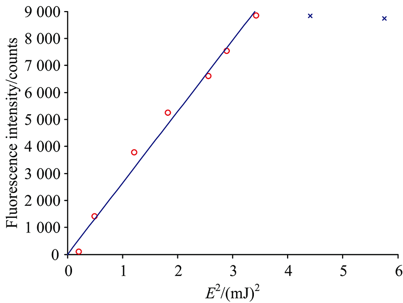 图7为不同激光能量条件下的荧光强度测试结果, 图中横坐标为激光脉冲能量的平方, 图中各点为测试结果, 由“ ×” 标示的数据已经进入非线性响应区域, 对“ ○” 标示的数据进行线性拟合, 可以看出激光脉冲能量在0.2~1.8 mJ时, 荧光强度随激光能量平方的增大线性增加, 随着激光能量继续增大, 荧光强度进入非线性区, 不再适合测量。