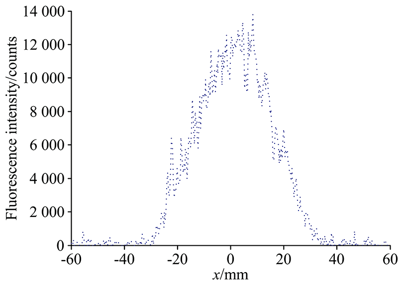 图8为表1中状态1流场条件下的氮原子荧光图像, 图中显示了ICCD各像素点接收到的光子数量(计数强度), 其大小反映了荧光的强度, 在测试系统未标定的情况下, 本文以该光子计数强度作为荧光强度。 提取荧光强度高于一定阈值的像素, 对其坐标位置进行拟合, 得到激光传输路径所在直线, 即荧光的中心线位置, 提取图8中该中心线位置的荧光强度, 如图9所示。 从图9中可以看出, 流场中心位置荧光强度最高, 沿径向向外, 其强度逐渐降低, 在距中心约±30 mm处降到几乎为0, 而在之前的关于氧原子荧光测量中这个下降趋势一直持续到在距中心线约±50 mm的位置, 并且在该两个位置各有一个小峰[8], 荧光出现这一偏差主要是由于氮分子的离解能较氧分子更高, 相同温度条件下, 氮原子的浓度较低。 同时由于激光能量密度最高区域在流场偏右一侧, 因此呈现出荧光强度并不十分对称, 最高强度及分布较中心偏右的情况。