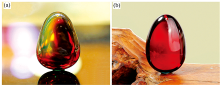 In recent years, Mexican blue amber has become popular and has an increasing market share. Red blue amber is one of the varieties of blue amber, it usually has a maroon oxide surface layer, and the inner amber has blue-green fluorescence under ultraviolet light, so it’s also called “red skin blue amber”. However, the red blue materials in Mexican amber are very scarce due to the limitation of the formation conditions. In this research, gemological characteristics and spectral characteristics of Mexican red blue amber were studied using gemological routine methods, microscopic observation, infrared spectroscopy and photoluminescence spectroscopy Mexican black skin amber was investigated as a comparison with red blue amber. The red skin of Mexican red and blue amber is often slightly transparent, and its interior is translucent to slightly transparent. The thickness of red skin is uneven, and it is composed of black dots wrapped and flowing. The red part shows weak to no fluorescence under long-wave ultraviolet, and the inside shows strong blue fluorescence. The FTIR absorption peaks at 1 723 and 1 233~1 046 cm-1 in the red part of the red blue amber are respectively caused by oxygen-containing groups C=O and C—O. The absorption peak caused by —CH3 is located at 2 928 cm-1. The oxygen-containing group C=O is the chromophore that makes red blue amber appears red. The absorption intensity ratio of the C=O peak and —CH3 peak of the red blue amber red part is about 4/5, and the inner part is about 2/5~1/2. The oxidation degree of the red part of red blue amber is stronger than the inner part, while the oxidation degree of red blue amber’s inside is higher than that of the black skin amber’s inside. Photoluminescence spectroscopy results show that the red part of red blue amber has different luminescence centers with the inner part. The luminescence centers of red part are located at 562 and 506 nm, while the inner part mostly emits 467 and 472 nm center. As the degree of oxidation increases, the luminescent center gradually shifts to red spectra region, and the fluorescence intensity is significantly decreases. C=O quenches the fluorescence of Mexican red blue amber. The inner part of the black skin amber has two wide luminescence centers of 489 and 466 nm. The fluorescence intensity of black skin amber inside is higher than that of red blue amber inside. This research provides a basis for the identification of Mexican red blue amber and is beneficial for readers to distinguish Mexican red blue amber from other origins and other varieties. It has important theoretical significance and market application value.