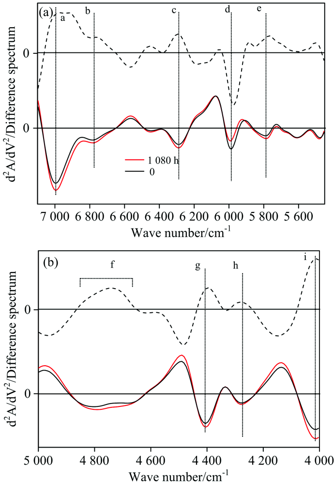 通过对照材二阶导数谱带减去1 080 h试材二阶导数谱带, 获得NIRs二阶导数差谱, 见图2。 差谱体现木材化学组分相对含量的增加或减少, 正值表示相对含量的增加, 负值表示相对含量的减少。 图2(a, b)分别表示光谱范围7 100~5 450和5 000~4 000 cm-1的差谱(虚线)和二阶导数光谱(实线), 字母编号见表2。