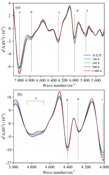 图1为谱带7 100~5 450 cm-1 (a)和谱带5 000~4 000 cm-1 (b)范围内未处理、 紫外光照射至1 080 h试材的NIRs二阶导数谱。 在NIRs区, 7 200~6 000 cm-1范围主要表征纤维素上羟基伸缩振动一次倍频, 6 000~5 400 cm-1范围主要表征脂肪族和芳香族C—H基团伸缩振动一次倍频与O—H基团的合频, 而5 000~4 000 cm-1谱带范围主要表征羟基伸缩振动与变形振动的合频、 以及与次甲基各种振动模式的合频[8]。