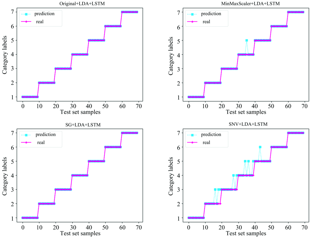 综合上述分析, SNV+LDA处理后的光谱数据建立的LSTM识别模型效果最差; 原始光谱数据经过LDA降维处理后建立的LSTM识别模型和MinMaxScaler+LDA处理后的光谱数据建立的LSTM识别模型有不错的识别效果和性能表现; SG+LDA处理后的光谱数据建立的LSTM识别模型在预测准确率、 训练过程准确率以及损失函数变化趋势都有更好的表现。