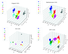 对原始数据及预处理后的荧光光谱数据进行LDA降维处理, 降维至3维特征数, 其降维效果图如图2所示。 由图2可得经SG预处理后的LDA降维聚类效果最为明显; 原始光谱数据及MinMaxScaler预处理后的数据进行LDA降维后效果相差不大; SNV预处理后LDA降维效果没有其他的效果明显。 基于这四种分别搭建LSTM识别模型。