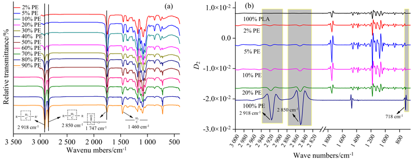 | 图4 PE-PLA体系的ATR-FTIR谱图 (a): FTIR谱图; (b): 低含量组分的二阶导数处理图Fig.4 ATR-FTIR spectra of PE-PLA system (a): FTIR spectra; (b): Second-order derivative processing diagram of low content components |