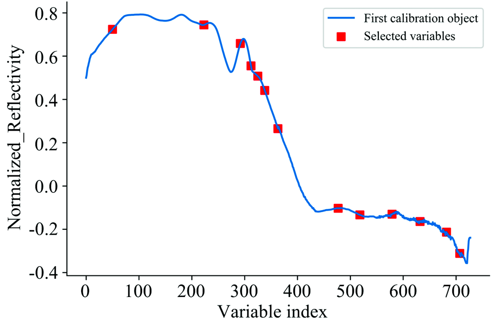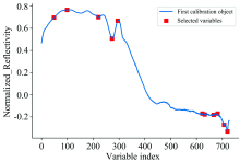 (1)连续投影算法(successive projections algorithm, SPA), 是前向特征变量选择方法。 SPA利用向量的投影分析, 通过将波长投影到其他波长, 比较投影向量大小, 以投影向量最大的波长为待选波长, 然后基于校正模型选择最终的特征波长, 对不同的候选特征子集分别建立多元回归模型。 SPA选择的是含有最少冗余信息及最小共线性的变量组合。
