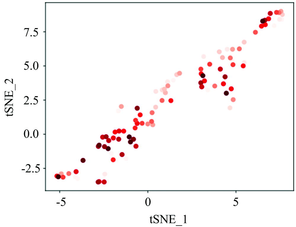 采用经典流形学习方法T分布随机邻域嵌入(tSNE)对预处理后的近红外光谱数据进行降维可视化分析[15](见图3), 评价其定量分析的潜力。 从图3可见, 掺假含量与主成分之间难以观察到明显的变化规律, 显示出在婴儿配方奶粉中进行皮革水解蛋白掺假定量分析具有一定的难度。 其主要原因是皮革水解蛋白为复杂混合物, 其近红外光谱特性较为复杂, 且皮革水解蛋白主要成分为动物性水解蛋白, 与奶粉中的蛋白质有一定的相似性。