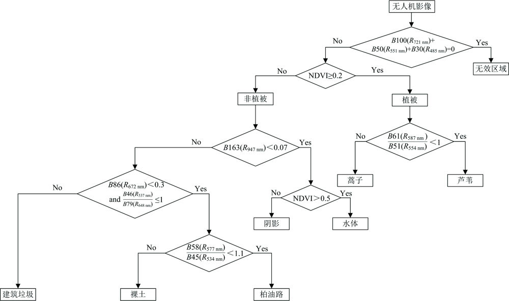 基于各类背景地物的光谱曲线, 分析不同背景地物的光谱特征差异, 选择特征波段。 研究区内无效区域是由于对无人机影像进行几何校正导致图像位置变化, 而显示结果仍然以矩形范围显示产生的“ 黑边” , 反射率为零; 分别选取红光波段721 nm、 绿光波段551 nm和蓝光波段485 nm, 利用三波段和为0将无效区域分离。 构造归一化植被指数(NDVI), 当NDVI大于等于0.2时首先将植被分离出去; 在554~587 nm区间内, 芦苇的光谱反射率逐渐降低, 蒿子的光谱反射率却逐渐升高, 因此通过波段比值法可以将植被进一步细分。 水体和阴影的光谱反射率整体较低, 光谱曲线变化较为平缓, 二者的光谱曲线在947 nm处同时处在波峰位置, 此时的光谱反射率值明显低于其他类型背景地物, 因此利用单波段阈值法将水体和阴影从影像中分离出来; 构造归一化水体指数(NDWI), 当NDWI大于0.5时提取水体; 裸土和柏油路的光谱反射率从672 nm处开始快速下降, 并且在537~648 nm之间同时存在反射峰和谷, 这是其他类型背景地物不具备的光谱特征, 首先利用单波段阈值法和波段比值法将二者分离出来; 对比分析二者光谱曲线, 发现裸土和柏油路在534~577 nm之间的曲线斜率存在差异, 因此通过波段比值法进行细分。 分离背景地物所构造的决策树如图3所示。