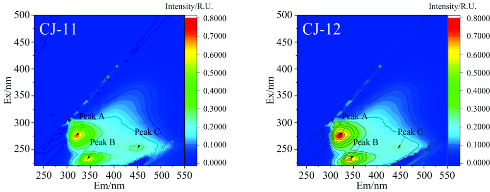 而对于荧光峰C, 从CJ-1至CJ-12, 其强度由0.372 R.U.逐渐降为0.237 R.U., 显示出与峰A和峰B完全不同的变化趋势, 可能是从上游至下游过程中, 对应的荧光物质逐渐稀释、 降解等原因造成的。