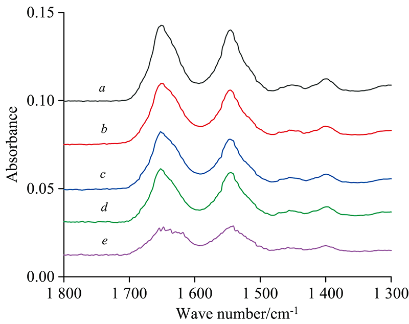 图4中, 曲线a对应于扫描空ATR晶体32次, 曲线b, c和d分别对应扫描空ATR晶体32次+扫描ATR水层N次。 b→ c→ d, 随着N增加, 水峰逐渐减弱, d为扣除溶剂水峰后的图谱。 当BSA水溶液进行85 ℃恒温水浴30 min后, BSA完全变性, 图4(e)与图4(a— d)有明显区别, 反映了BSA变性的实际状况。