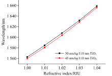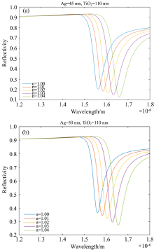 为了研究TiO2薄膜传感器对折射率的传感性能, 进一步确定Ag膜的厚度, 我们分别仿真了不同折射率环境下TiO2=110 nm; Ag=45和50 nm的光谱, 如图5所示。 可知随着折射率的增加, 波谷位置所在的波长不断增加, 反映了反射光谱随折射率的增加发生红移, 且共振幅度也在增大。 因此可以通过测量谱线的偏移来计算环境折射率的变化。
