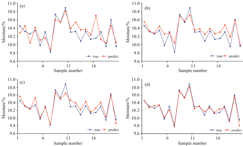 | 图8 玉米数据不同建模方法预测效果对比 (a): PLSR模型; (b): BP模型; (c): SAE模型; (d): SSAE模型Fig.8 Prediction results of different modeling methods for corn data (a): PLSR model; (b): BP model; (c): SAE model; (d): SSAE model |