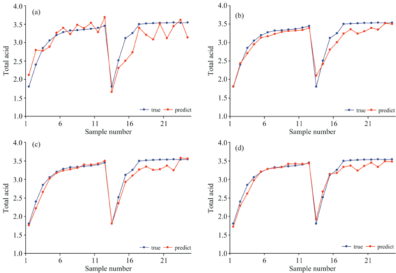 图9为黄酒总酸含量在采用不同方法下的预测结果对比。 图9(a)可知, 基于PLSR模型的预测值与真实值之间相差较大。 图9(b)为基于BP神经网络模型的效果, 模型的预测值与真实值之间的趋势大致相同, 在数值上还有一定的差距。 图9(c)和图9(d)分别是基于SAE和SSAE方法建模的效果, SAE方法能够提取数据深层的特征, 预测效果相比于BP神经网络有所提升。 SSAE在提取数据深层特征的同时加上了监督信息, 使得最终的预测效果最佳。