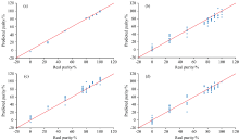 针对测试集样本, 基于DCGAN、 左右平移、 叠加噪声以及平移+噪声四种数据增强方法结合1DCNN算法所建定量模型的预测纯度与真实纯度相关曲线分别如图5(a), (b), (c)和(d)所示。 从图5可以清晰地看出: 基于DCGAN-1DCNN方法所建掺伪珍珠粉定量模型的预测纯度与真实纯度非常接近, 预测精度最优。
