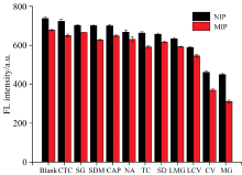 按照1.5的实验方法, 考察在2.5 μ mol· L-1的SG, SD, SDM, CAP, TC, LCV, CV, CTC和NA乙腈溶液和MG乙腈溶液对MIP和NIP的荧光猝灭程度, 结果如图4所示。