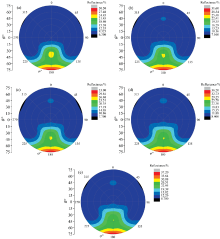 如图6、 图7、 图8所示, 无烟煤一号、 贫煤、 气煤3种煤中, 同一种煤在各特征波长间表现出了相似的反射率分布特征, 其中无烟煤一号在后向反射方向15° 反射角附近出现局部热点; 贫煤在后向反射方向45° 反射角附近出现局部热点, 前向反射方向40° 反射角附近出现局部热点; 气煤在前向反射方向50° 反射角附近出现局部热点。 如图9所示, 褐煤二号在1 400, 1 700和1 900 nm 3个特征波长处表现出相对较明显的后向反射特征, 后向反射方向45° ~60° 反射角附近出现局部热点, 2 200和2 300 nm 2个特征波长处的后向反射特征相对不明显。 此外, 褐煤二号还在1 400, 1 700和1 900 nm 3个特征波长处, 90° 和270° 方位角的45° 反射角方向附近出现局部热点。