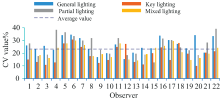 在心理物理实验中, 数据是通过人的感受得到的, 可能存在不稳定性, 需要分析观察者之间数据的稳定性。 本文采用差异系数(coefficient of variation, CV)来比较观察者之间的数据稳定性[8]。 经计算后核实, 见图3中CV数据均在心理物理实验CV的正常范围内, 平均值为27.04%, 最大数据为39.20%, 因此22位观察者的视觉数据是可靠的, 均可作为实验的有效数据[9]。