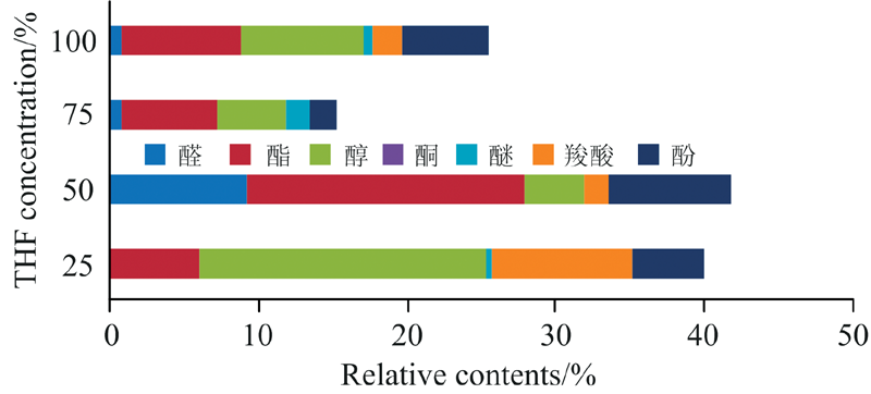 对比发现, THF浓度分别为25%, 50%, 75%和100%抽提下, 酸化煤抽提率比原煤分别增加了275%, 120%, 45%和11%, 表明酸化预处理可增大溶剂对煤的抽提率, 促进有机低分子化合物的溶出, 且溶剂浓度越低影响效果越大。