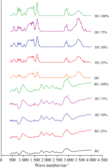 为表述方便, 对原煤和酸化预处理的煤样分别以RC和DC表示, 对其元素组成和工业进行了分析测试, 测试结果见表1。 可以看出, 煤样经酸化预处理后, 灰分与固定碳含量降低, 水分、 挥发分相对含量增加, 其中灰分含量降低幅度最大, 从15.23%降至0.43%; 元素组成中, C和H的相对含量减小, O和N相对含量增大。