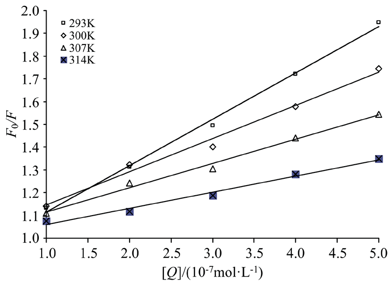 | 图2 不同温度下柠檬黄对BSA荧光猝灭的Stern-Volmer方程曲线图Fig.2 Stern-Volmer curve for the fluorescence quenching of BSA by tartrazine |