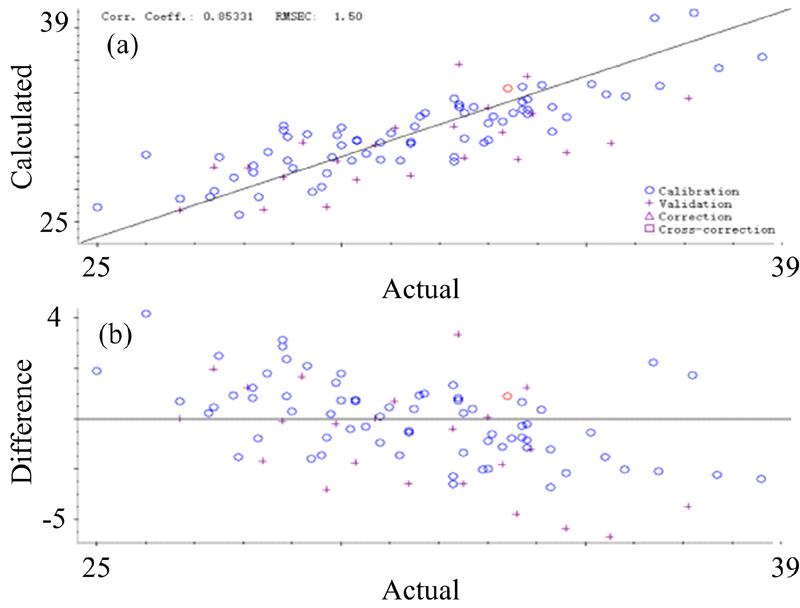使用TQ Analyst软件进行建模, 采用偏最小二乘法(partial least squares, PLS), 光程分别使用恒定(constant)、 多元散射校正(multiplicative singal correction, MSC)、 标准正态变换(standard normal variate, SNV), 处理方法选择原始光谱(spectrum)、 一阶导数(frist derivative, 1st)、 二阶导数(second derivative, 2st)。 评价参数分别为: 相关系数(related coefficient, r)、 校正标准偏差(standard error of calibration, RMSEC)、 预测标准偏差(standard error of prediction, RMSEP), 计算公式为