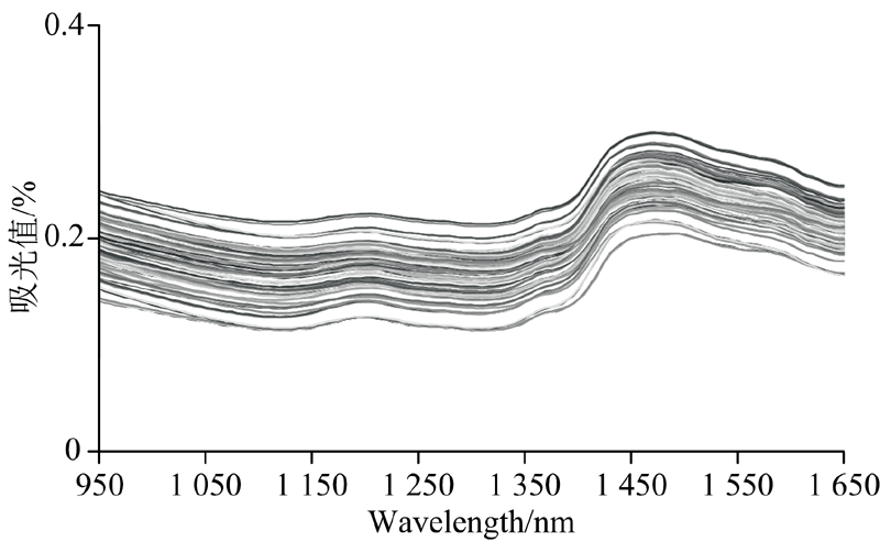 利用近红外光谱成像仪(DA7250, Perten, Sweden), 光谱范围为900~1 700 nm, 实际工作的光谱波长范围为950~1 650 nm, 波长精度< 0.3 nm, 光谱分辨率为7 nm, 二极管间距(像素间距)3.1 nm· 像素-1, 检测器为InGaAs, 电温控制冷处理, 256像素, 内置线性参考光源。 可驱动载有样本的旋转杯, 用来控制系统运行的计算机以及近红外成像系统采集软件。 为保证获取光谱的一致性, 检测温度为15~25 ℃, 样品厚度一致为5 mm, 湿度范围为30%~70%, 每个样品至少扫描三次以获得光谱数据, 所有光谱曲线的波形呈现相同的趋势(图1), 在全波段范围内进行青饲大豆全株品质指标的模型建立。