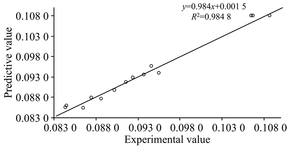 图1是吸光度的试验值和预测值的对比, 相关系数R2为0.984 8, 斜率为0.984 0, 接近于1, 说明该模型预测较准确, 也说明基本上可以利用该模型代替试验的真实点对试验的结果进行全面分析。