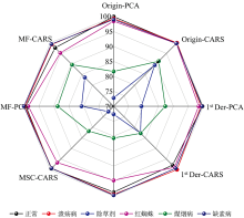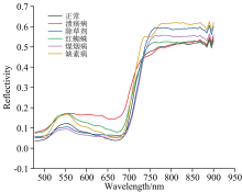 根据光谱曲线分析可知, 六类叶片的光谱曲线呈现典型绿色叶片特征, 总体趋势相同。 由于叶绿素吸收作用, 在500 nm附近的蓝紫光区域和680 nm附近的红光区域有两个强吸收带; 由于叶绿素反射作用, 在550 nm附近呈现一个反射率峰, 720 nm后形成高反射率台阶, 这部分叶绿素对植物生理变化反应最为灵敏, 常用来区分植物种类和诊断植物所受胁迫状态。 因不同病虫药害叶片光谱曲线有交叉重叠区域, 仅依据光谱曲线无法准确区分类别, 需后续光谱数据处理和建模。