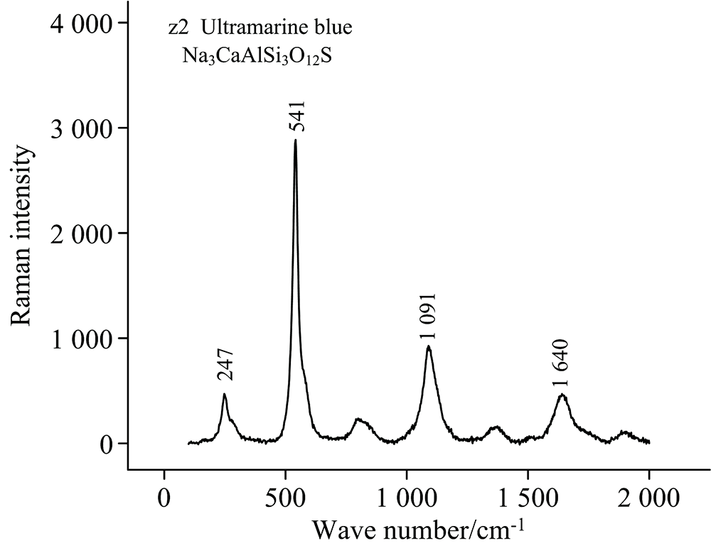 随着拉曼光谱仪器的改进及颜料数据库的不断补充, 人工合成材料也得以有效鉴别。 样品z1, z2, z3颜料未在扫描电镜及能谱分析中获取有效信息, 拉曼光谱分析结果见图7— 图9。 样品z1的红色颜料经拉曼检测为颜料红14, 样品z2的蓝色颜料为群青, 样品z3的绿色颜料为酞菁绿[9]。 颜料红14属NapthtolAS类有机合成颜料, Napthtol AS系列的偶氮染料源自棉质染料的开发, 因其色域广、 色牢度及色密度良好、 制备原料成本低等优势, 发展成重要的商业染料, 其中一些不溶于水的染料可用作颜料, 颜料红14就是其中一种[10]。 群青分天然群青与合成群青, 前者由青金石研磨制成, 矿物杂质较多, 后者是由高岭土、 硫磺、 烧碱等混合烧制而成。 合成群青自1828年法国等西方国家研制成功后, 清代晚期从欧洲传入中国, 1927年我国可以自主合成[11]。 酞菁绿是由酞菁染料合成的绿色颜料[12], 合成于20世纪30年代, 因其颜色明亮、 稳定性好、 不溶于水, 广泛应用于印刷油墨、 涂料等材料中, 说明此处壁画修复时期不早于1930年。
